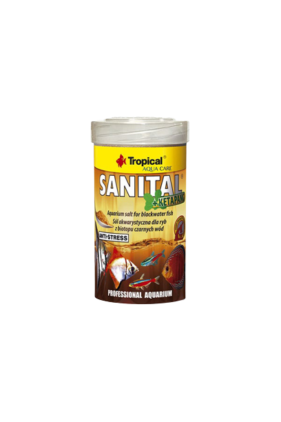 Sanital + Ketapang is an aquarium salt with Ketapang leaves (Terminalia catappa) and oak bark extracts. Intended for conditioning of aquarium water for blackwater fish such as discus, angelfish, neon tetra etc., and brackish water fish. The addition of vitamin B1 alleviates stress, which is particularly important in case of numerous timid fish such as characins. Tannins and humic acids from the extracts of Ketapang and oak bark make the environment of the tank safe and healthy for the fish. The influence of these substances is particularly important in case of fish weakened by transportation, undergoing acclimatization period, or suffering from skin abrasions and injuries; after water changes and in new tanks with a high risk of toxic nitrite development.